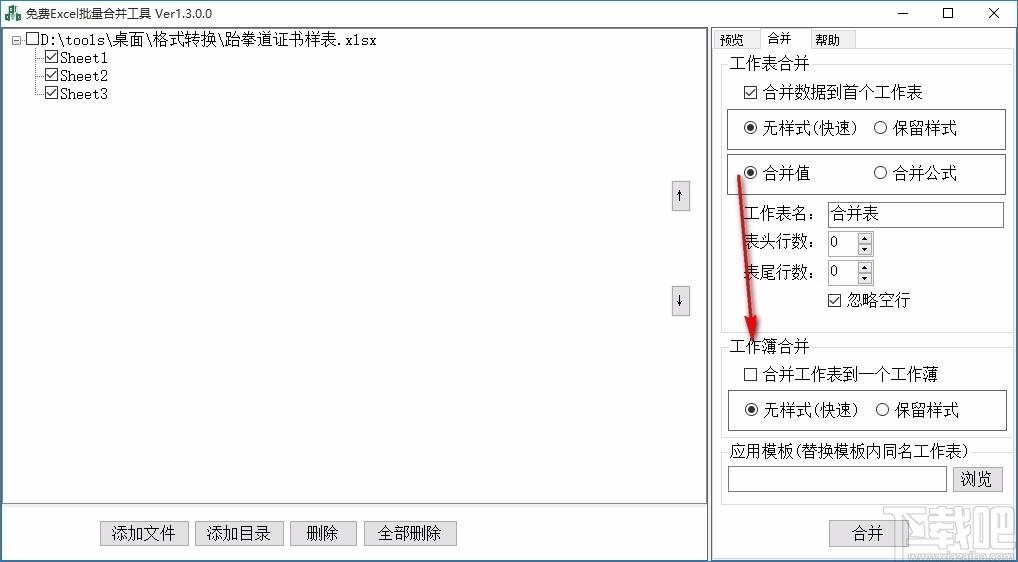 5、工作表合并,可对工作表名、表头行数、表尾行数等进行设置